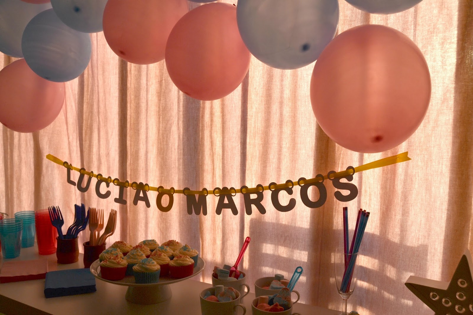 Pero todos quisieron cenar muy rápido porque la sorpresa de la noche llegaba con el postre. Junto a la ventana puse cupcakes, cake pops, chucherías y limonada bien fresquita, junto con vasos, tenedores y servilletas en colores rosa y azul (¡como no!).
